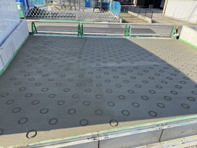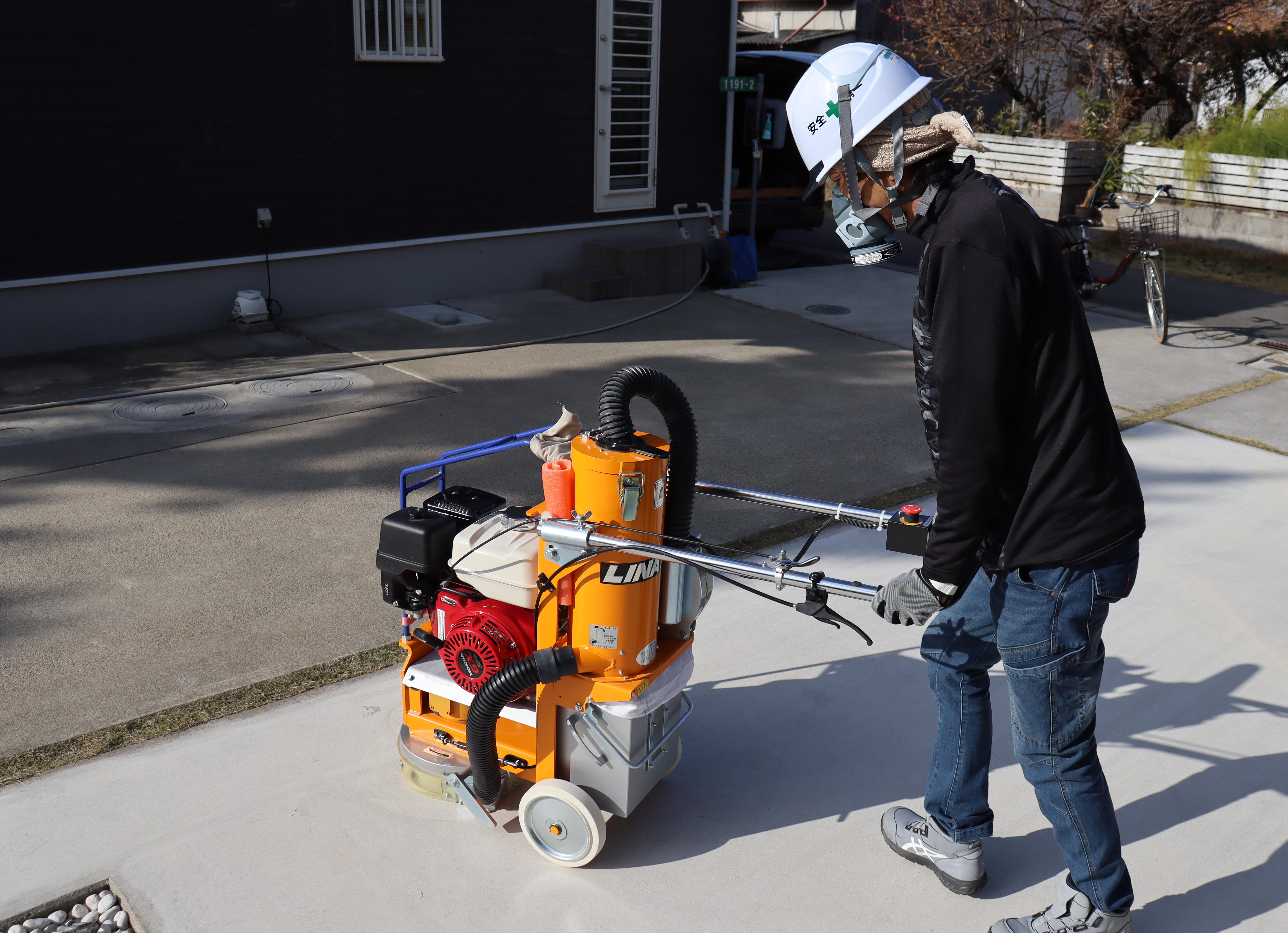 コンクリートの配合や天候・温度にもよりますが、一般的にコンクリートが打ちあがり20~40分経過した後施工します。(目安は100㎡前後です)